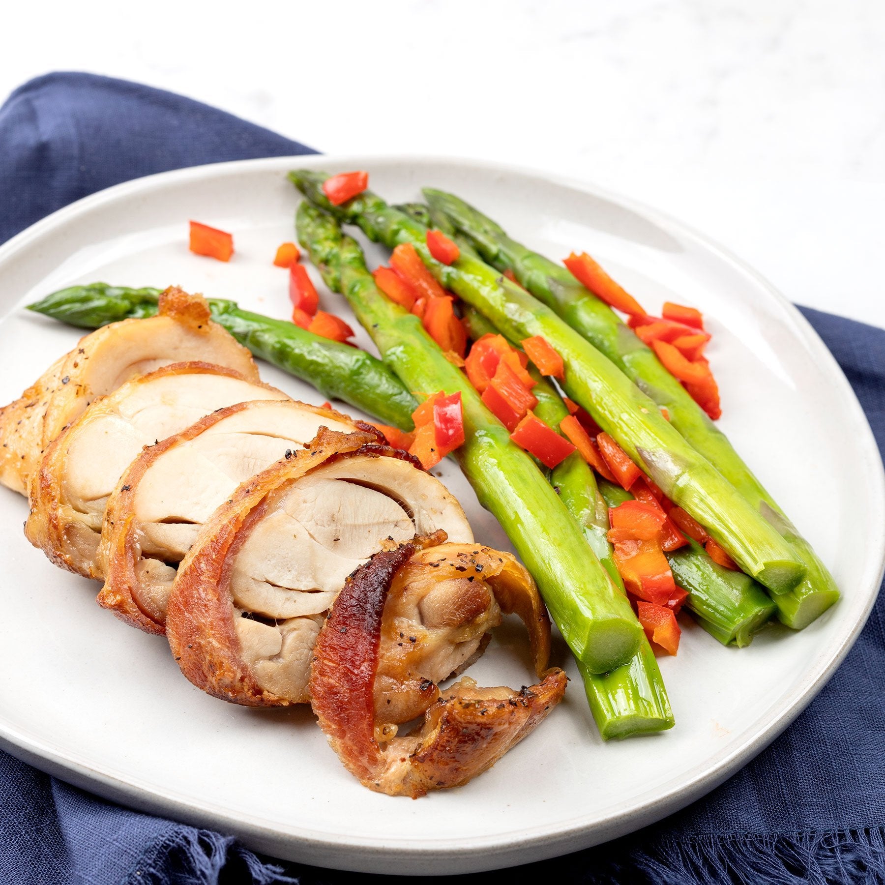 Bacon Wrapped Chicken Thighs With Roasted Asparagus & Red Peppers