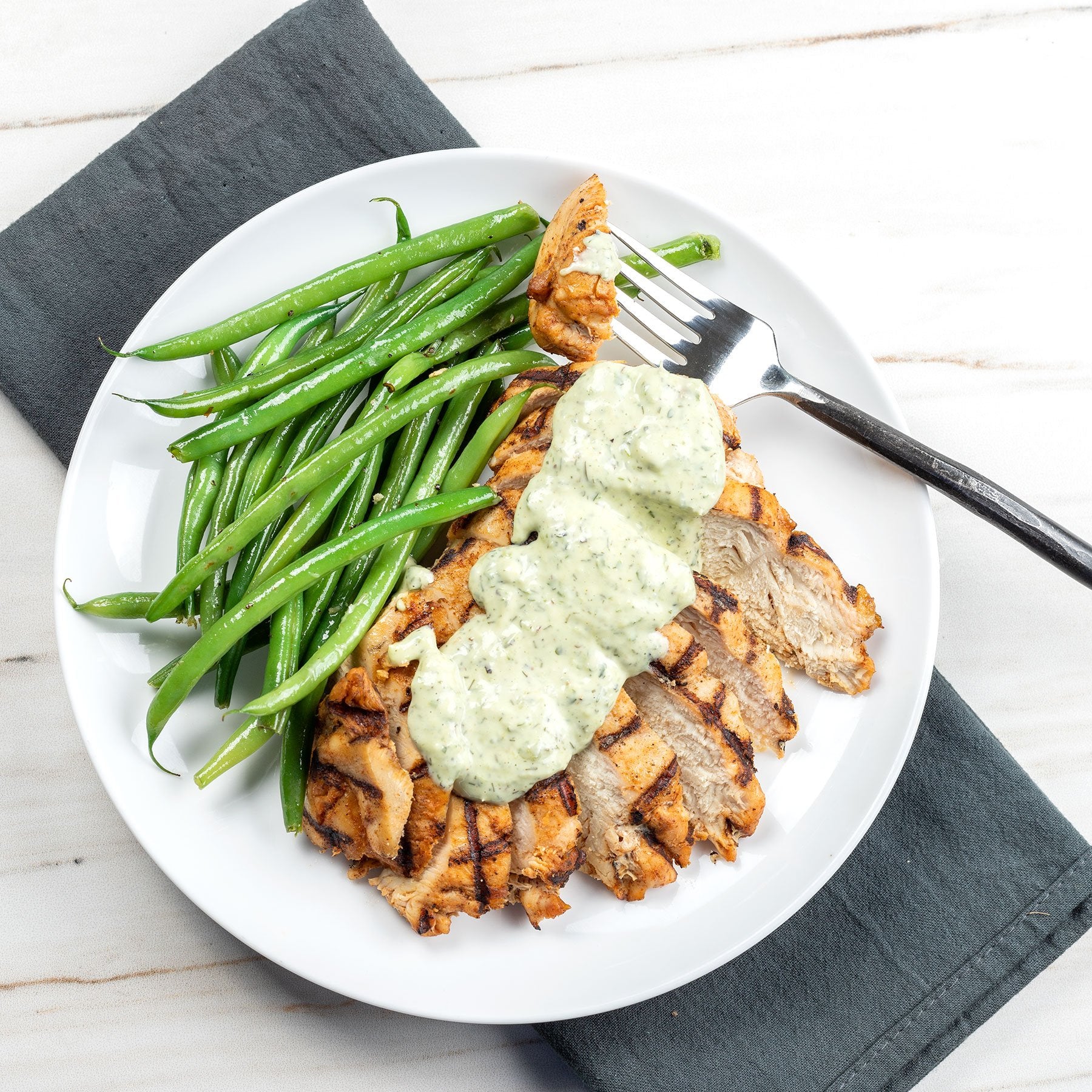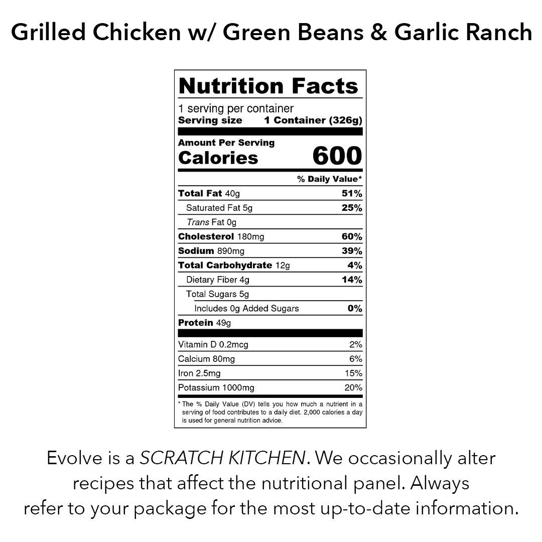 Chicken Breast, Green Beans (green beans, olive oil, salt, pepper), Roasted Garlic Ranch (evolve ranch dressing (evolve mayo (grapeseed oil, egg yolk, red wine vinegar, lemon juice, brown mustard (vinegar, water, mustard seed, salt, spices), kosher salt), water, scallions, lemon juice, kosher salt, garlic, black pepper, onion powder, dill, parsley), roasted garlic (garlic, olive oil, salt, pepper)), Olive Oil, Salt, Pepper