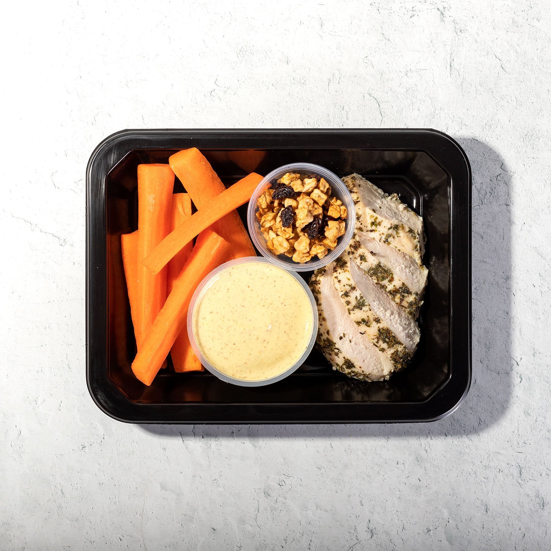 Herb Chicken (chicken breast, herb chicken rub (oregano, parsley, thyme, black pepper, rosemary, sage, basil, kosher salt), Carrots, Dijonaise (evolve mayo (grapeseed oil, egg yolk, red wine vinegar, brown mustard (vinegar, water, mustard seed, salt, spices), mustard (water, mustard seeds, vinegar, salt, citric acid, potassium metabisulfite (preservative), lemon juice, cayenne pepper), Apple Cinnamon Trail Mix (dried apples (dried apples, sulfur dioxide (for color retention), potassium sorbate (preservative), raisins, dried cranberries (cranberries, sugar, sunflower oil), kosher salt, vanilla extract (water, alcohol (35%), sugar, vanilla bean extractives), ghee - organic valley, cinnamon)