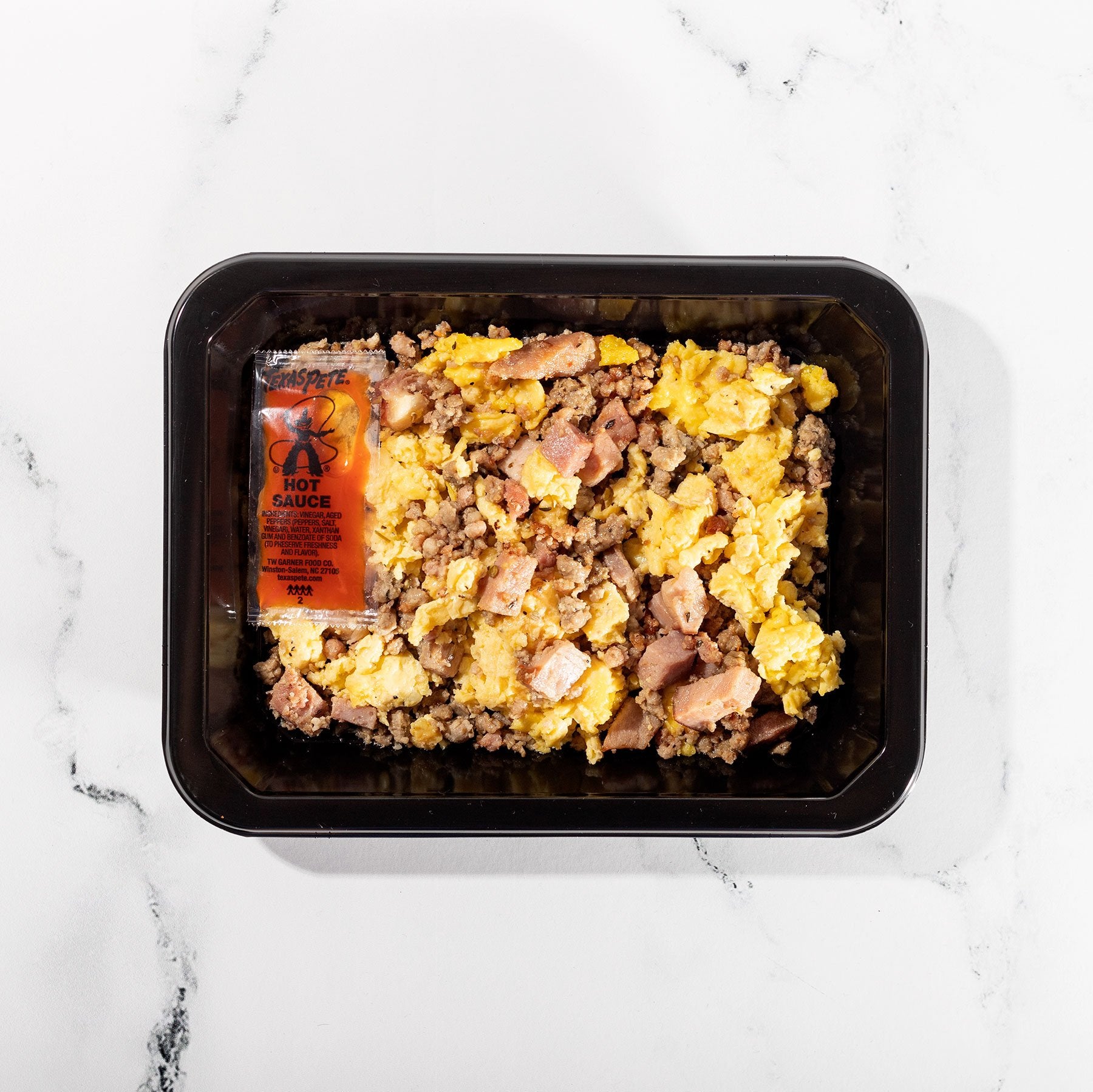 Eggs, Ham, Bacon, Italian Sausage (pork, red wine vinegar, parsley, italian seasoning (marjoram, thyme, rosemary, savory, sage, oregano, basil), fennel, red pepper flakes), Texas Pete Hot Sauce (vinegar, aged peppers (peppers, salt, vinegar), water, xanthan gum and benzoate of soda (to preserve freshness and flavor)