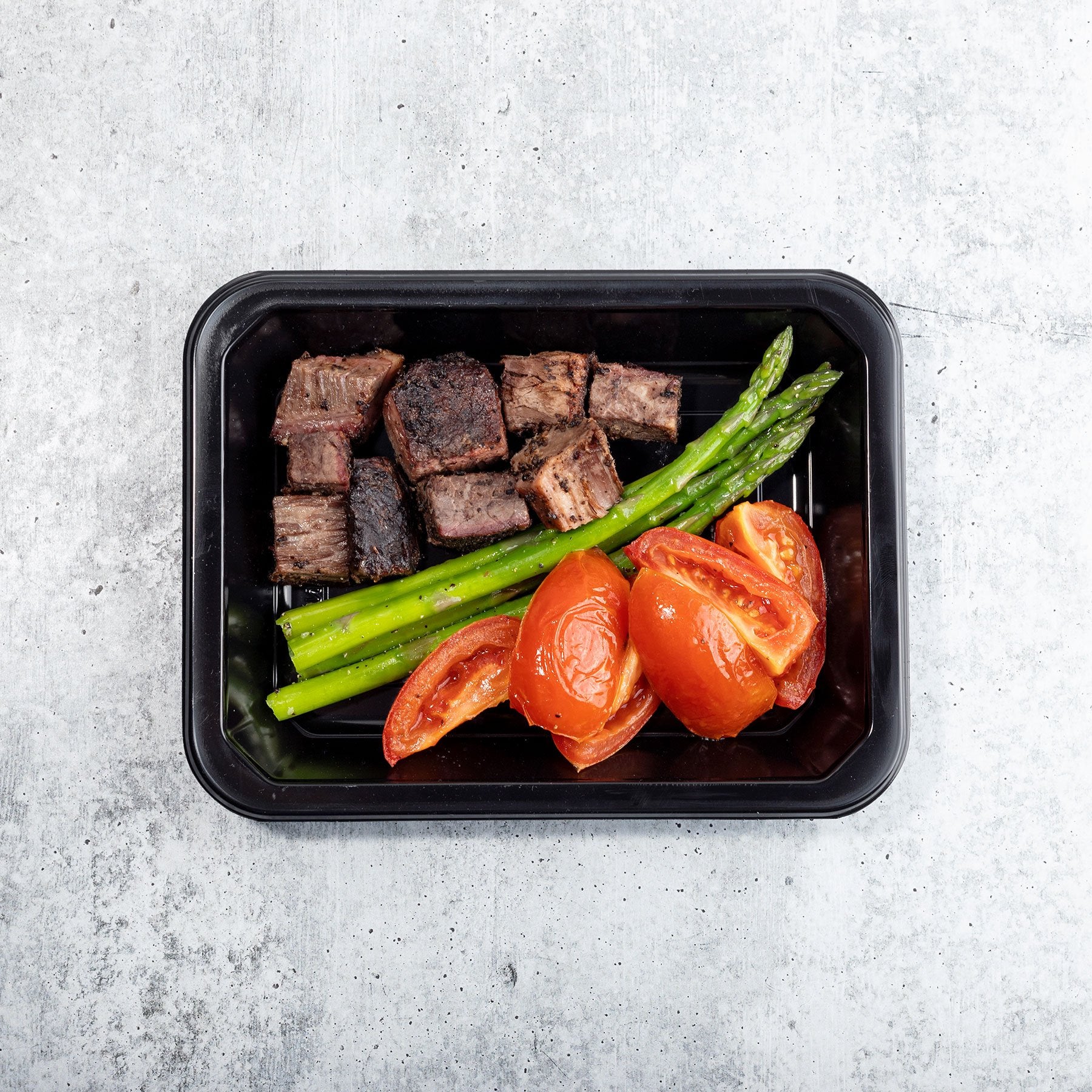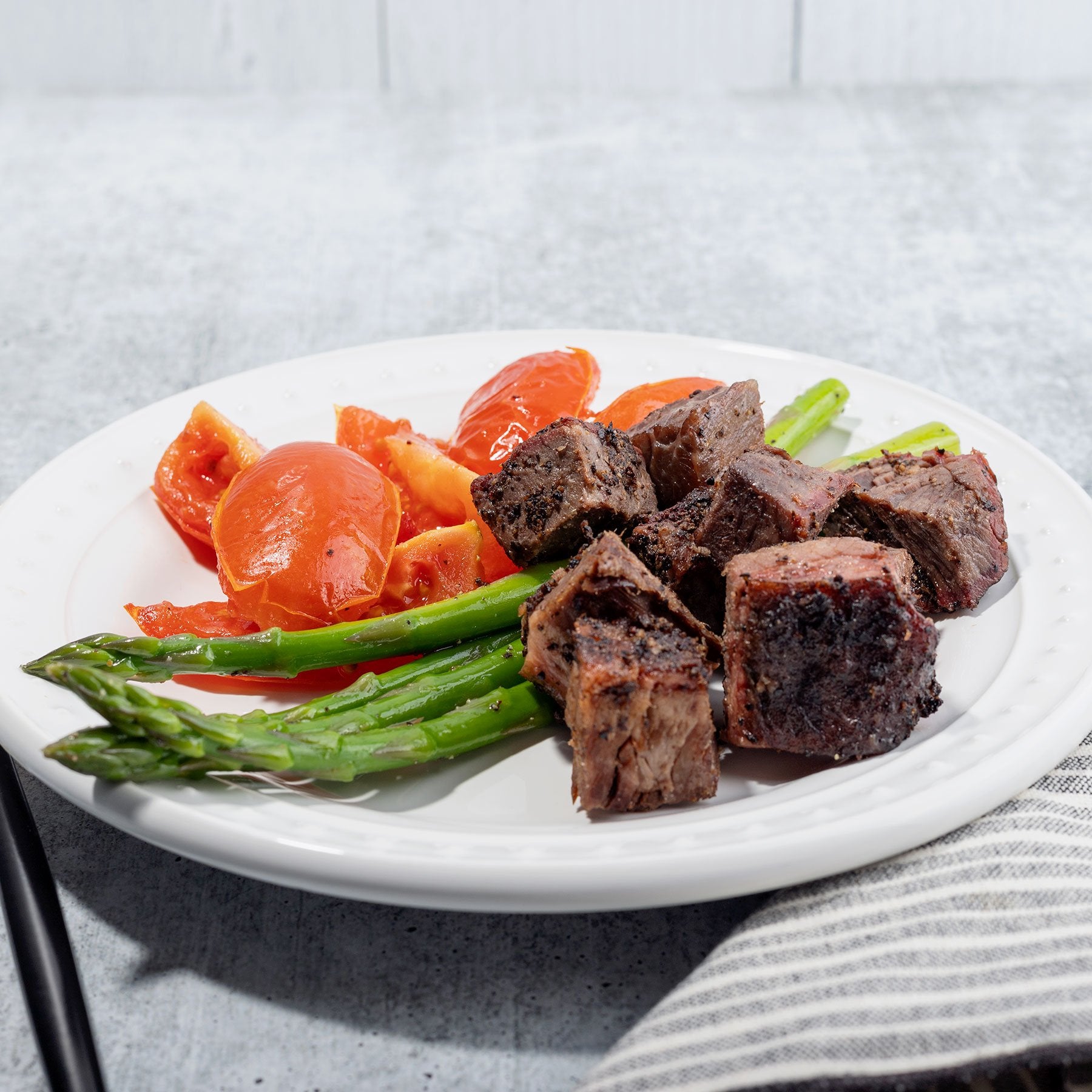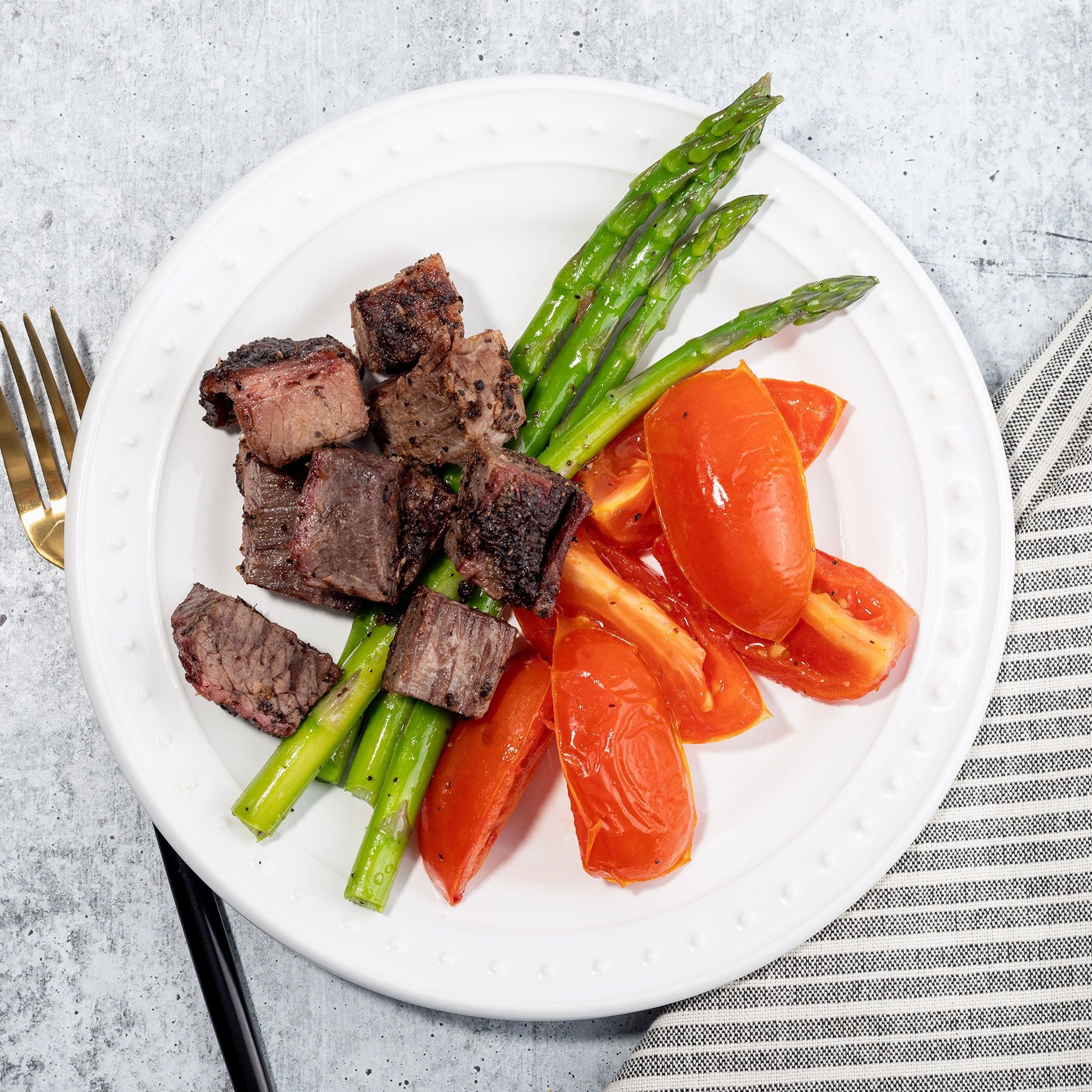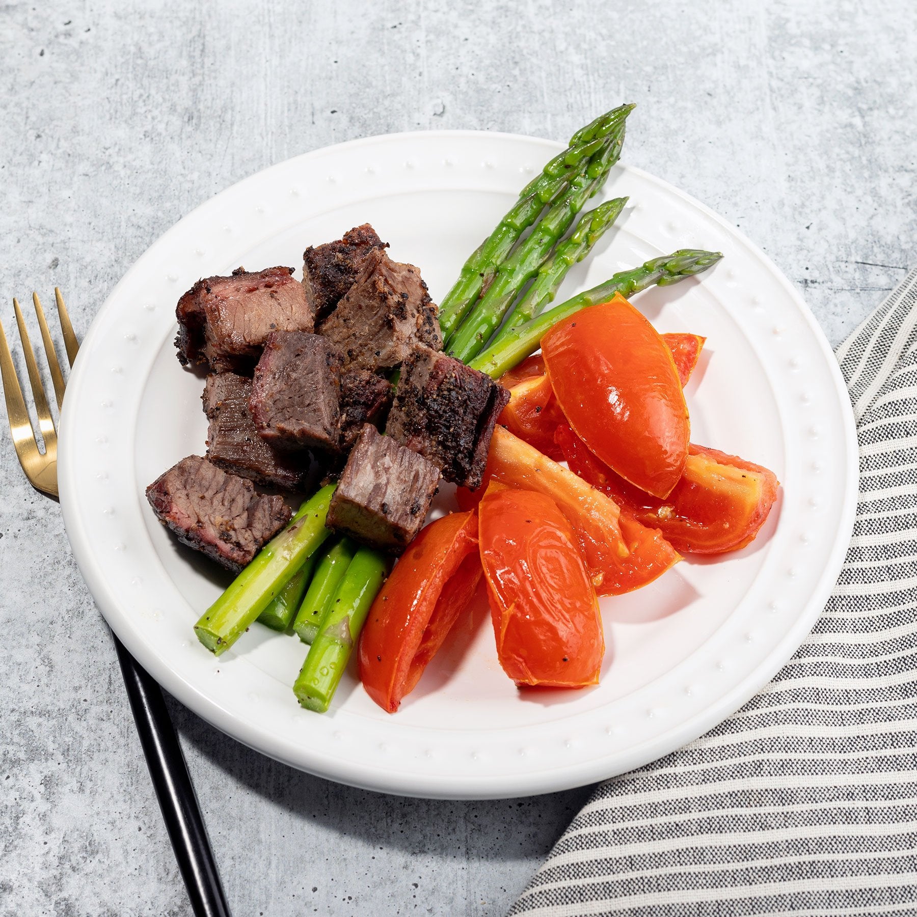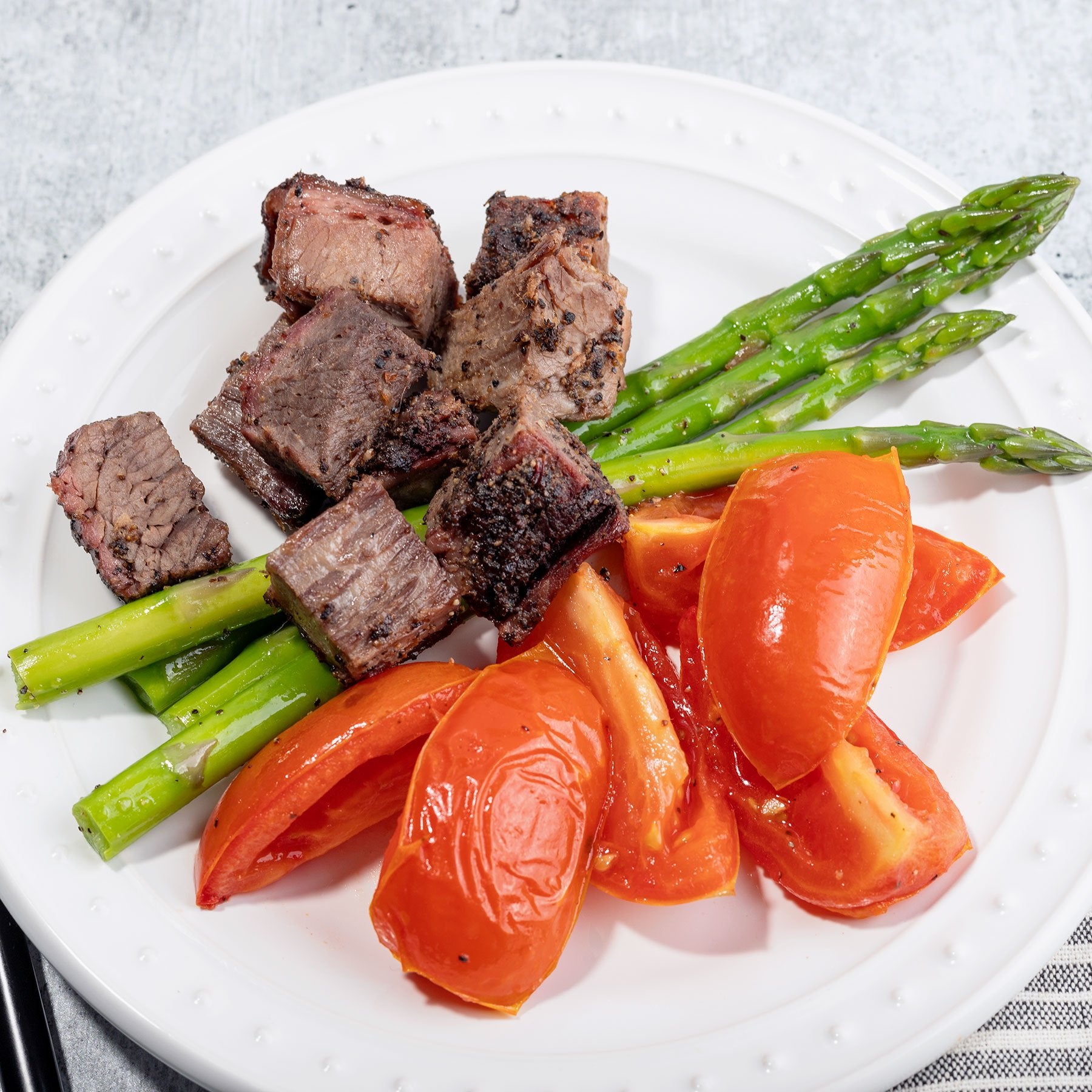 Roasted Tomatoes (tomatoes, olive oil, salt, pepper), Black Pepper Brisket (beef, brisket, whole, salt, pepper, paprika, salt, garlic, onion, black pepper), Blanched Asparagus (asparagus, olive oil, salt, pepper)