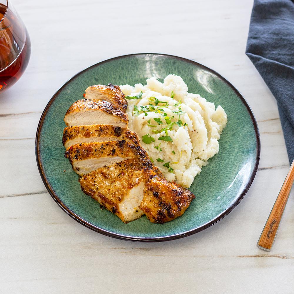 Chicken, Mashed Potatoes (cauliflower, chicken stock (water, chicken, celery, carrot, onion, parsley, thyme, bay leaves, black peppercorn, salt), clarified butter, salt, pepper), Olive Oil, Salt, Pepper, Gravy (chicken stock, water, arrowroot, garlic, pepper, salt), Parsley