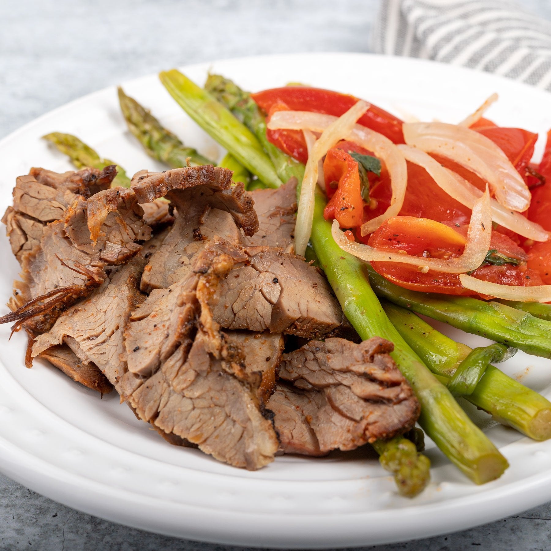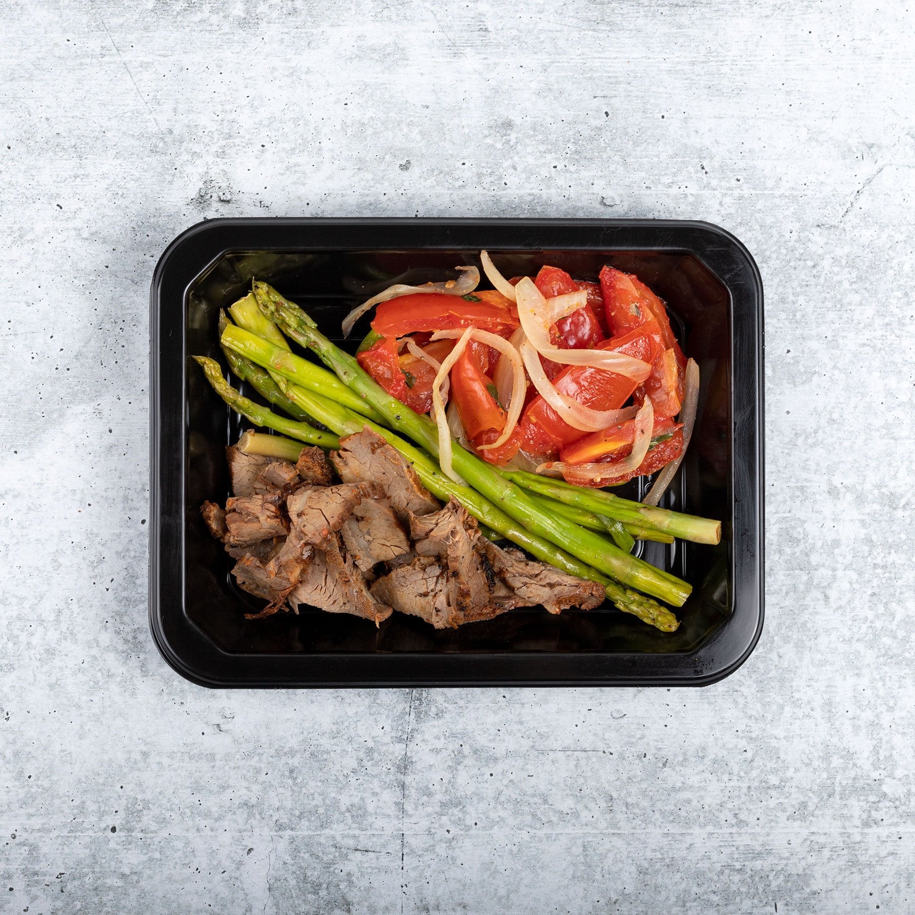 Sliced flank steak seasoned and grilled to a nice medium and paired with fresh asparagus and a warm tomato salad. Evolve + Low Fat = Delicious