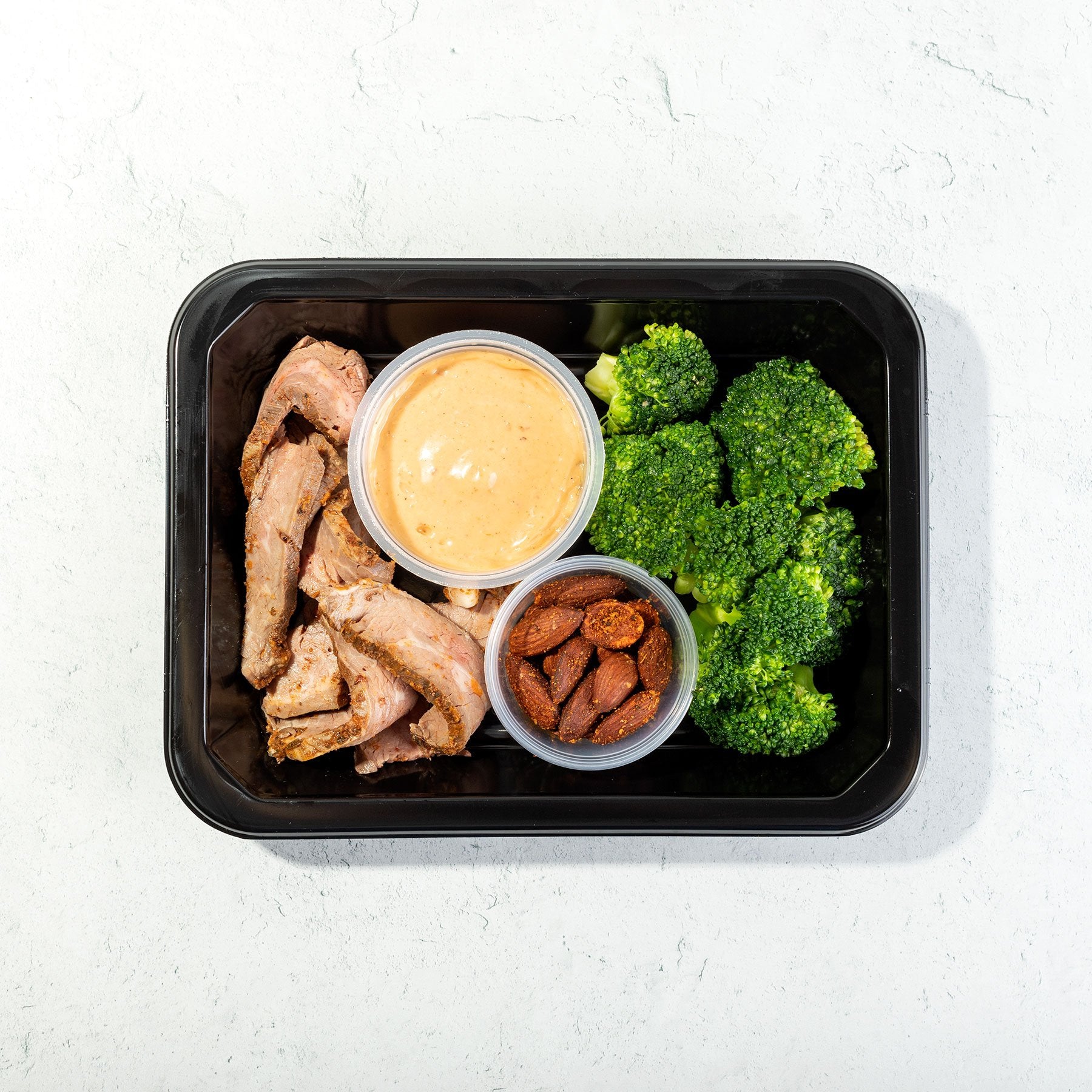 Beef (beef, paprika, kosher salt, garlic), Broccoli, Chipotle Mayo (evolve mayo (grapeseed oil, egg yolk, red wine vinegar, brown mustard (vinegar, water, mustard seed, salt, spices)), chipotles in adobo (chipotle peppers, water, tomato paste, salt, sugar, onion, acetic acid)lemon juice, granulated garlic), Cajun Almonds (almonds, paprika, kosher salt, garlic, onion, ghee)