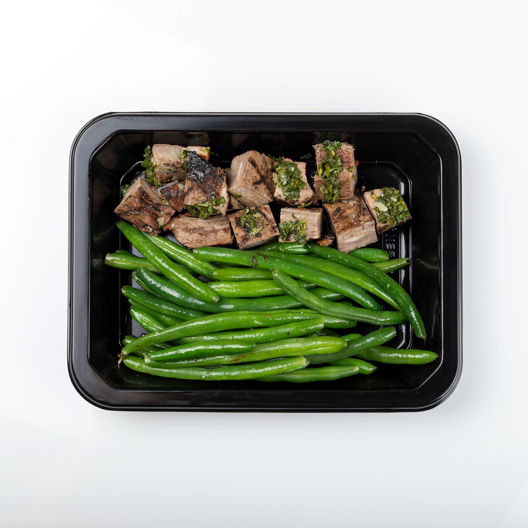 Green Beans (green beans, olive oil, salt, pepper), Beef Tips (beef, montreal steak seasoning (coriander, minced onion, black pepper, granulated garlic, kosher salt, paprika, red pepper flakes, dill), olive oil), Chimmichurri (cilantro, red wine vinegar, lime juice, parsley, olive oil, onions, green onions, oregano, garlic, cumin, red pepper flakes, salt, pepper)